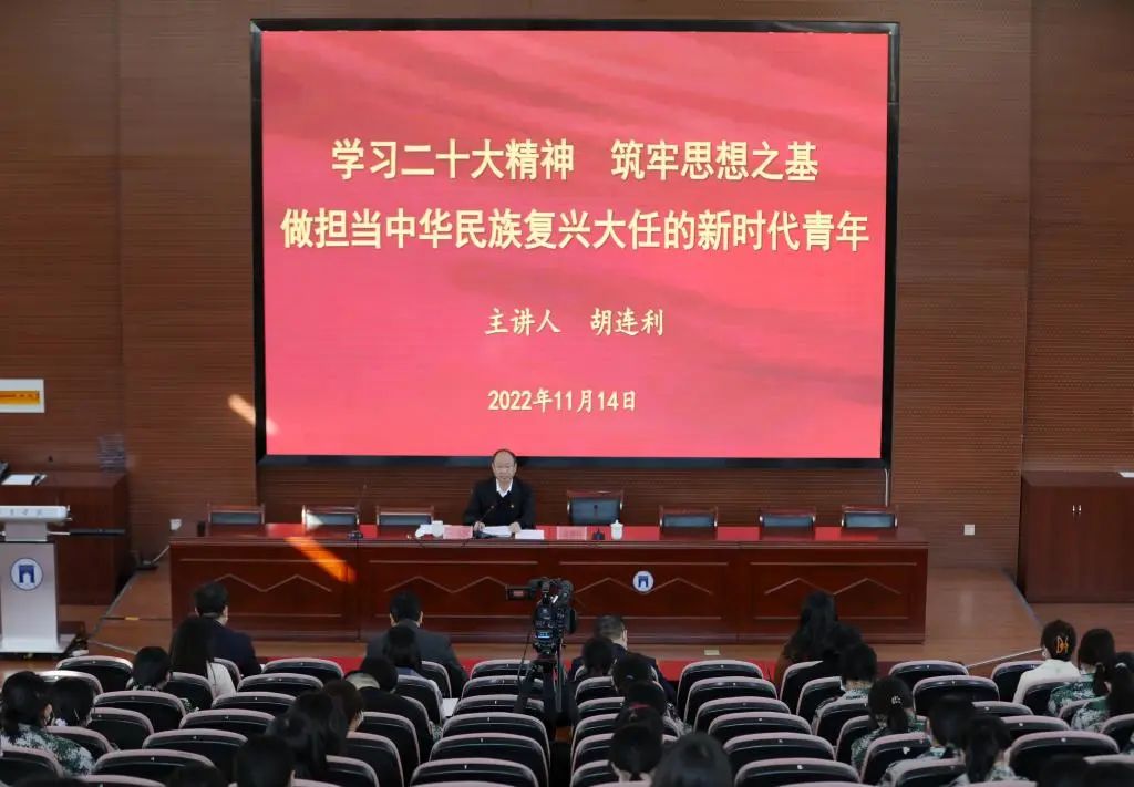 11月14日下午,党委书记胡连利以《学习二十大精神 筑牢思想之基 做担当中华民族复兴大任的新时代青年》为题,为beat365中国官网师生宣讲党的二十大精神。