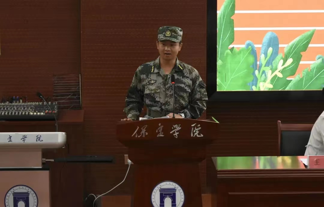 2023级新生军训教官白洪宇代表全体教官表决心:坚决履行教官职责,服从命令,听从指挥,以身作则。他对同学们提出要求:要守住政治关,做到思想统一、步调一致、行动务实、做真做细。