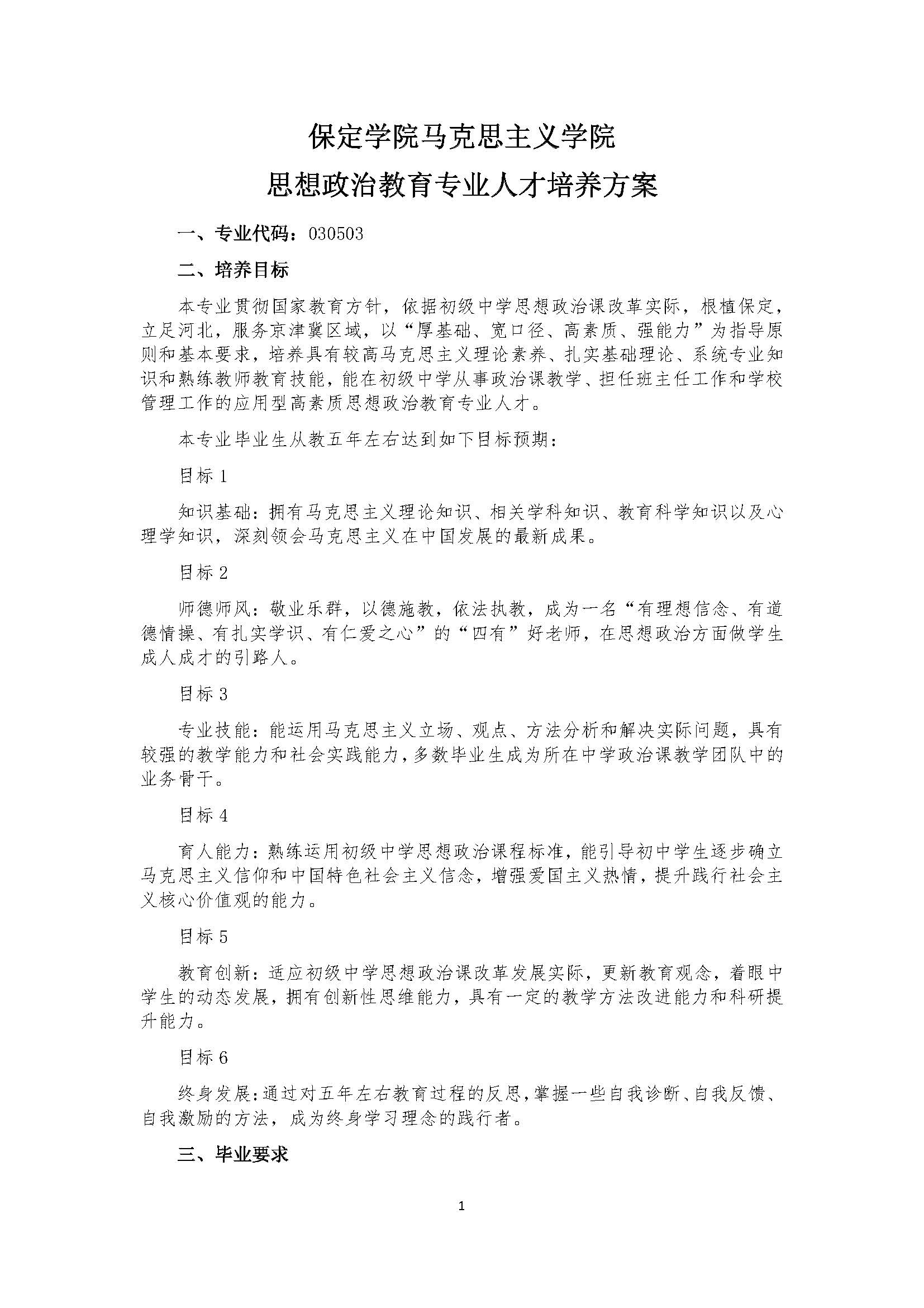 本专业贯彻国家教育方针,依据初级中学思想政治课改革实际,立足于京津冀地区并面向全国,以“厚基础、宽口径、高素质、强能力”为指导原则和基本要求,培养具有较高马克思主义理论素养、扎实基础理论、系统专业知识和熟练教师教育技能,能在初级中学从事政治课教学、担任班主任工作和公司管理工作的应用型、高素质思想政治教育专业人才。