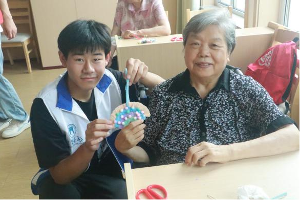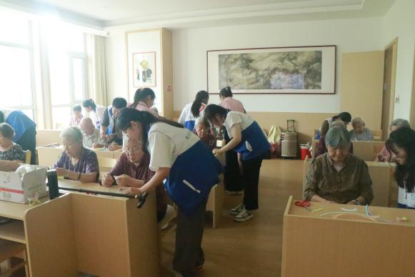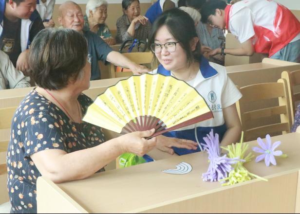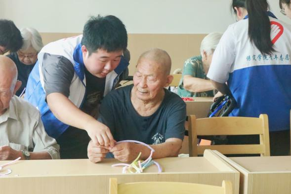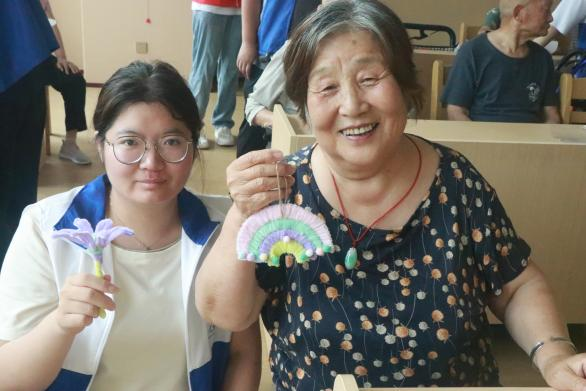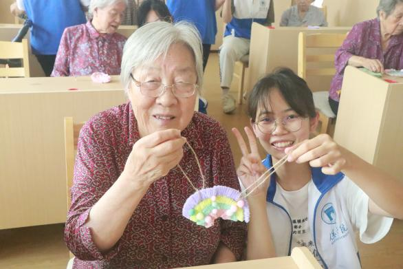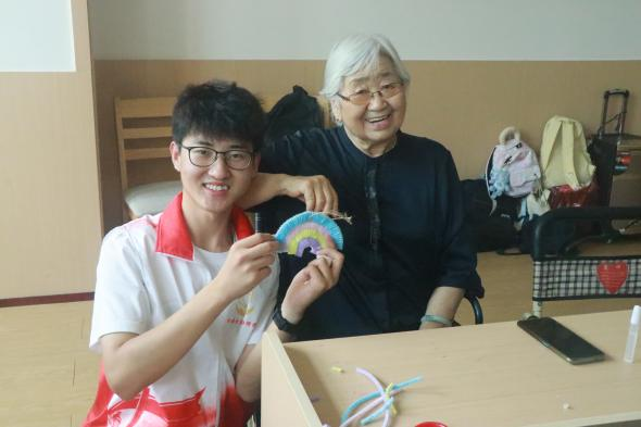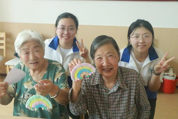团队成员还陪伴老人做趣味手工,通过做手工锻炼老人的动手能力,丰富他们的晚年生活。看着老人脸上欣慰的笑容,同学们内心也得到了满足。在手工完成之后,老人还开心地与同学们合影留念。