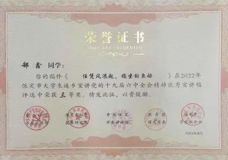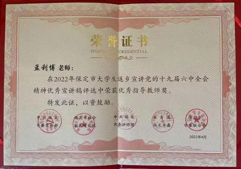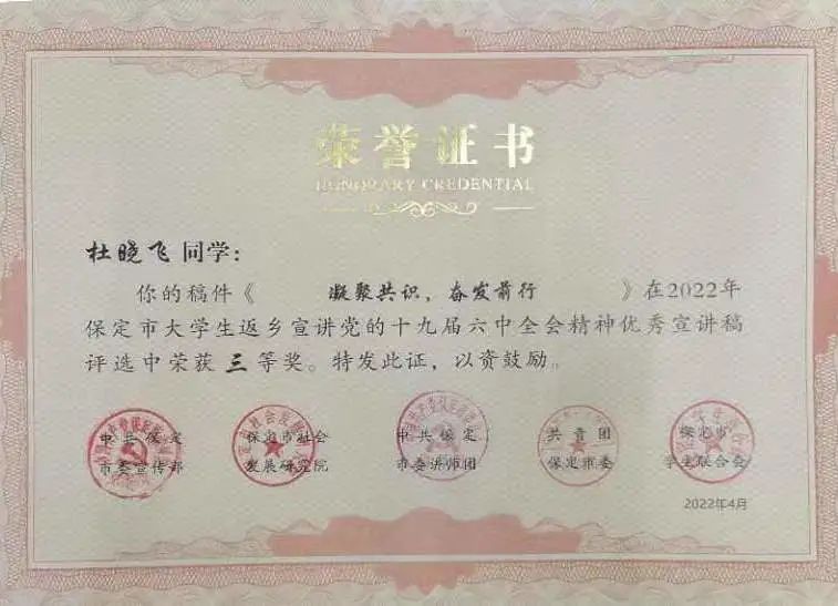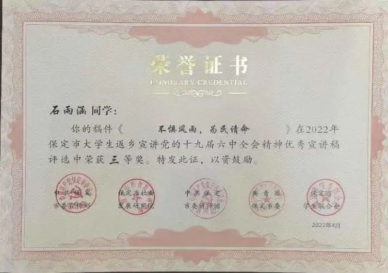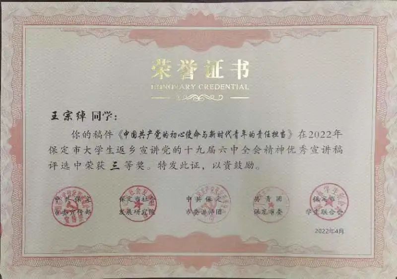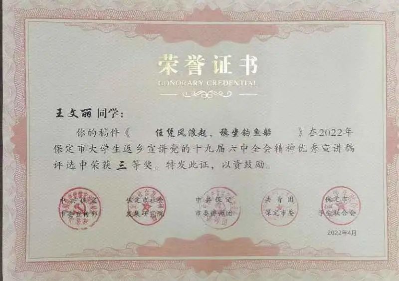 为深入学习宣传贯彻党的十九届六中全会、省第十次党代会和市第十二次党代会精神,激发“青春友好之城”活力,保定市于2022年1月—5月开展“学习贯彻党的十九届六中全会精神,讲好保定红色故事”活动,beat365中国官网学子踊跃报名参加并取得优异成绩。