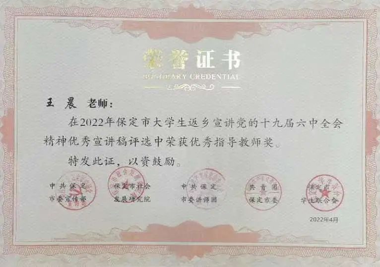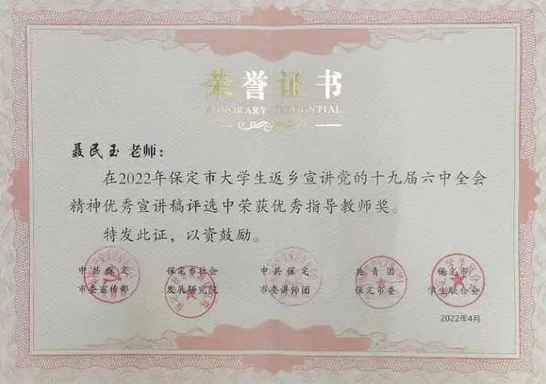公司员工王宗绰、杜晓飞、郜鑫、石雨涵、王文丽获得返乡宣讲党的十九届六中全会精神优秀稿件三等奖,王晨老师、孟利博老师、聂民玉老师获得优秀指导教师奖。