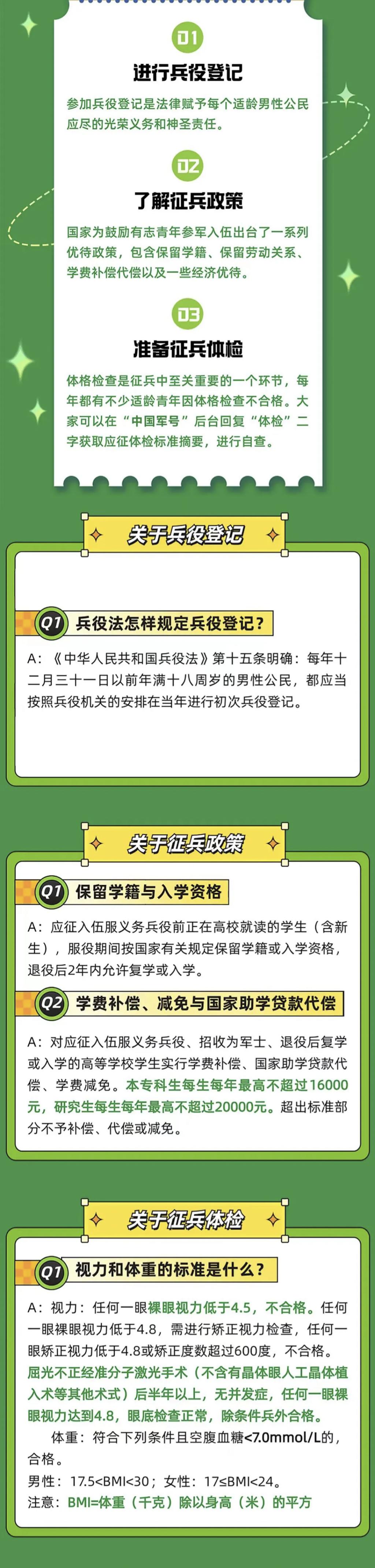 男兵应征报名对象:高中(含中专、职高、技校)毕业生及以上文化程度的青年(含高校在校生),年满 18 至 22 周岁(2002年1月1日——2006年12月31日出生);普通高等公司本专科毕业生、上半年符合毕业条件的毕业班员工,年满 18 至 24 周岁;研究生毕业生及在校生放宽至 26 周岁;初中毕业文化程度男青年,年满 18 至 20 周岁。