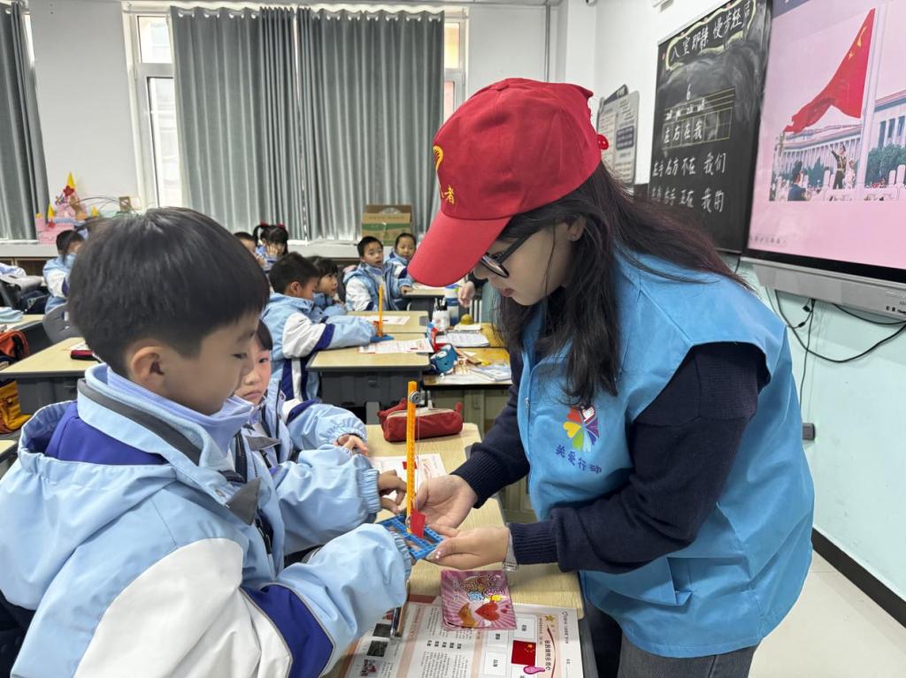 为了让员工能够更好分辨党旗、国旗、军旗、团旗、队旗等不同旗帜,志愿者们开展了“祖国旗帜我会贴”活动,让员工们动手制作国旗贴画,并在作业单上贴上相匹配的贴纸。随后志愿者们还带领员工们亲自操作迷你国旗升降台,让员工动手尝试升降,增强员工的动手能力和团队合作精神。