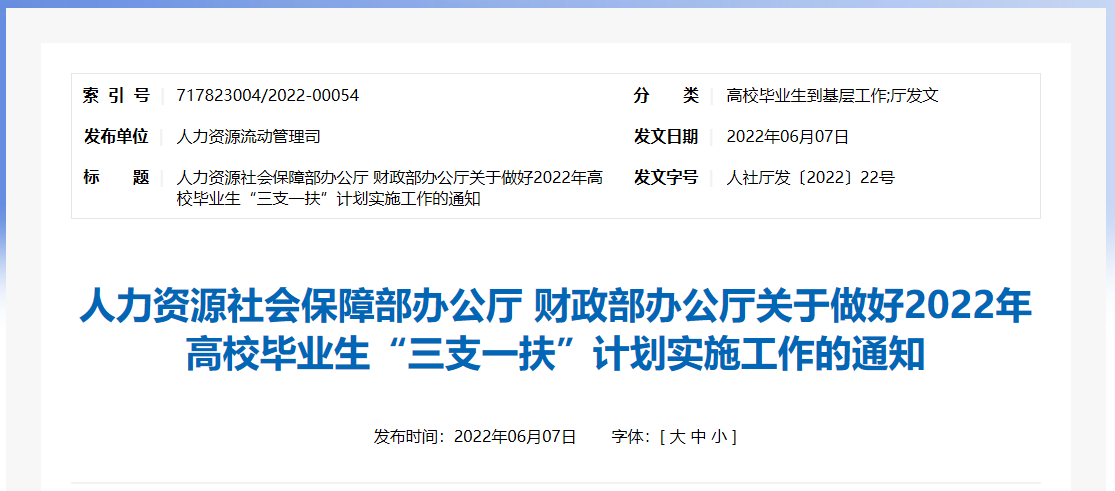 为贯彻落实党中央、国务院关于进一步引导鼓励高校毕业生到基层工作的决策部署,按照《中共中央组织部、人力资源社会保障部等十部门关于实施第四轮高校毕业生“三支一扶”计划的通知》(人社部发〔2021〕32号)部署安排,2022年继续选拔招募高校毕业生到基层从事“三支一扶”(支教、支农、支医和帮扶乡村振兴)服务,现就有关工作通知如下。